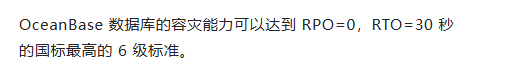在整体部署中,就可以完成数据库经常提到的容灾,多可用区,跨物理机房等在传统数据库中很难躲到的事情。在OB 官方文档中,显示OB可以做到 RPO=0,RTO=30秒的国际最高等级。