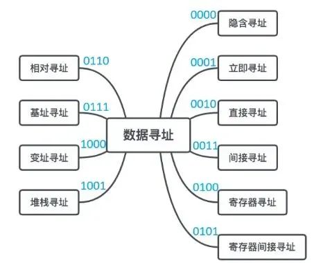 以下列出十种数据寻址。由于只有十种,所以可以用四位二进制来表示不同的寻址特征,计算机看到这四位二进制便能知道要做怎样的操作: