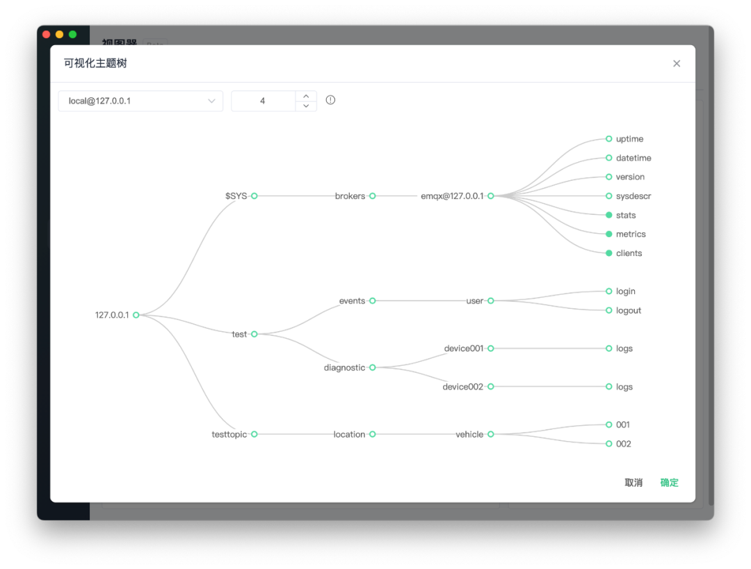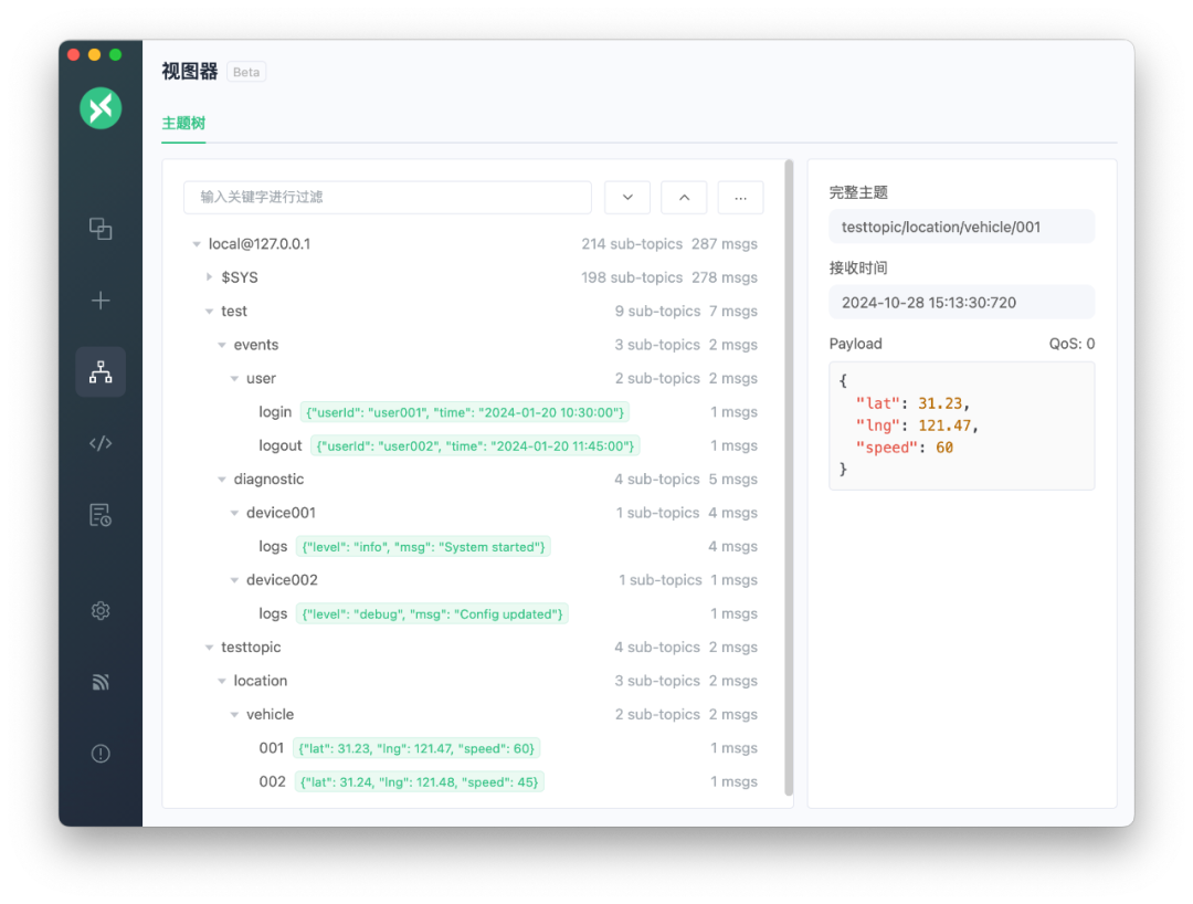 此版本引入了主题树可视化功能,这是一种强大的管理方式,可以层次化地组织和监控 MQTT 主题。此外,我们还在桌面端和 CLI 客户端中添加了对 Avro Schema 和 Message Pack 格式的支持,扩展了 MQTTX 的数据格式处理能力。这些更新为用户提供了增强的工具,以便更好地理解 MQTT 消息流和管理复杂的数据结构。