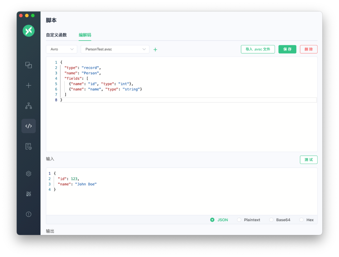编解码页面为 Avro 编解码测试提供了直观的界面。在这里您可以: