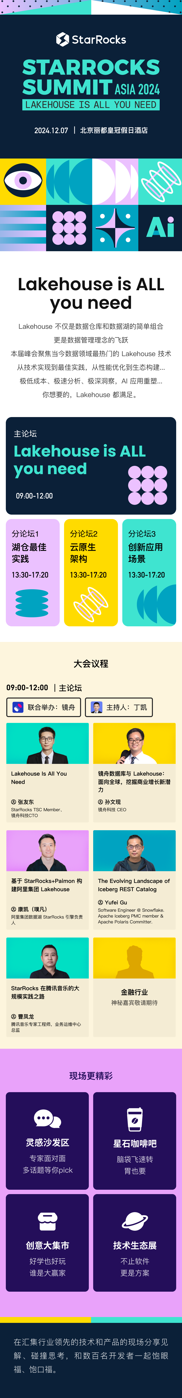 StarRocks TSC Member、镜舟科技 CTO 张友东的《Lakehouse Is All You Need》,将分享 StarRocks 在湖仓的技术路线规划,并阐述基于Lakehouse 架构的技术优势与发展方向。