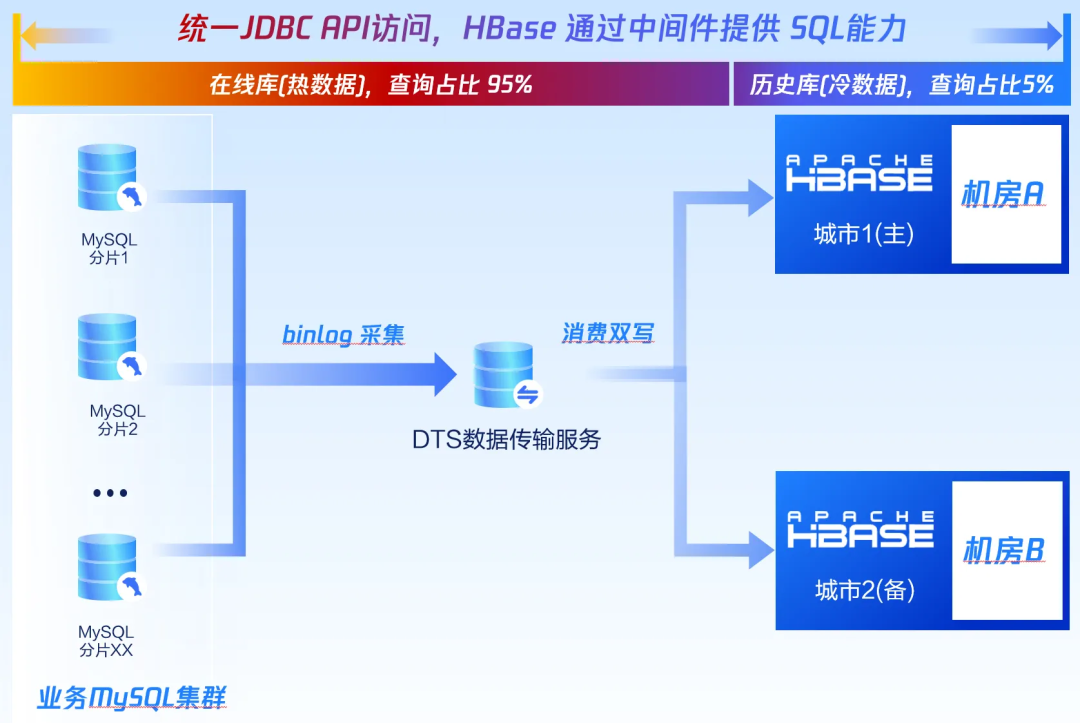 ● 在线库热数据的查询占比95%,历史库 HBase 冷数据的查询占比5%。