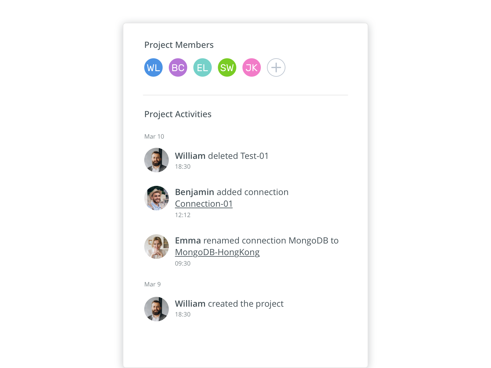 所有协作活动都会在活动日志中进行实时跟踪,让你轻松监控项目中发生的一切。你还可以查看特定团队成员最近的行动,让每个人都能清楚地了解其他人在做什么。