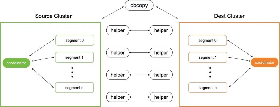 由上图可以看到,cbcopy 架构设计直观明了,在源集群与目标集群的计算节点之间建立一一对应关系,直接实现数据的高效迁移,充分发挥所有计算节点的并行处理能力和通信带宽的优势。