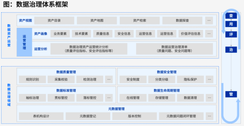 数据治理并不是一个新概念,国内外已有众多机构专注于其理论和实践研究,推动了相关理论和技术的发展。其中,国际数据管理协会(DAMA)将其定义为在管理数据资产过程中行使权力和管控,包括计划、监控和实施。通俗地讲,所有旨在提高数据质量的技术、业务和管理活动,均属于数据治理的范畴。数据治理的最终目标是提升数据利用率和数据价值,通过有效的数据资源管控手段,实现数据的看得见、找得到、管得住、用得好。