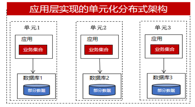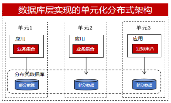 分布式的实现可以通过数据库解决(分布式数据库)也可以通过应用解决,大部分开发人员,尤其是传统行业或城商行等金融机构,开发能力比不上大行,人员规模有限,他们更希望数据库做的事情更多一些,比如分布式事务的实现、数据拆分的实现,尽量对开发人员透明。所以他们会直接采用分布式数据库,以单元化架构为例如下图: