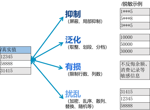 抑制是指通过隐藏数据中部分信息的方式来对原始数据的值进行转换,又称为隐藏技术。有损是指通过损失部分数据的方式来保护整个敏感数据集,适用于数据集的全部数据汇总后才构成敏感信息的场景。