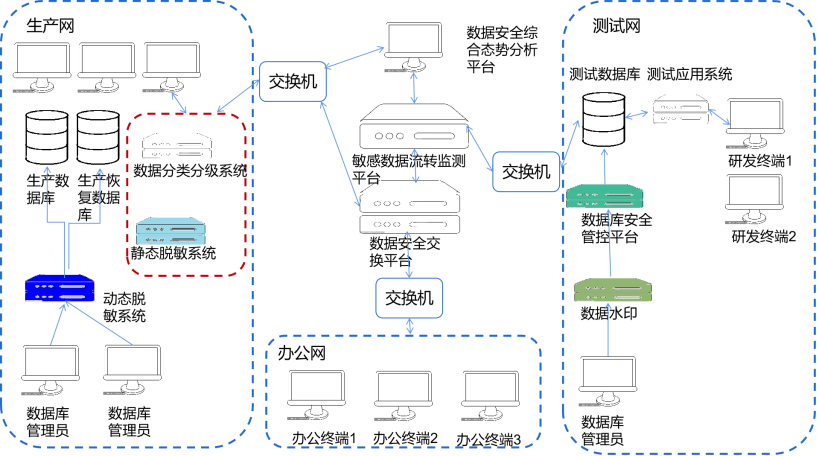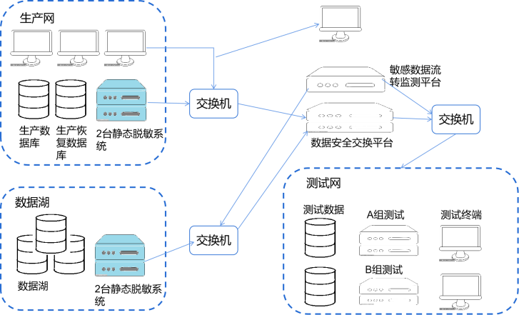 (1)为提高测试数据使用效率,以及自动化脱敏需求。搭建管控用一体化的国产化数据脱敏平台,打通‘生产-测试’环境,搭建一体化测试数据沙箱。