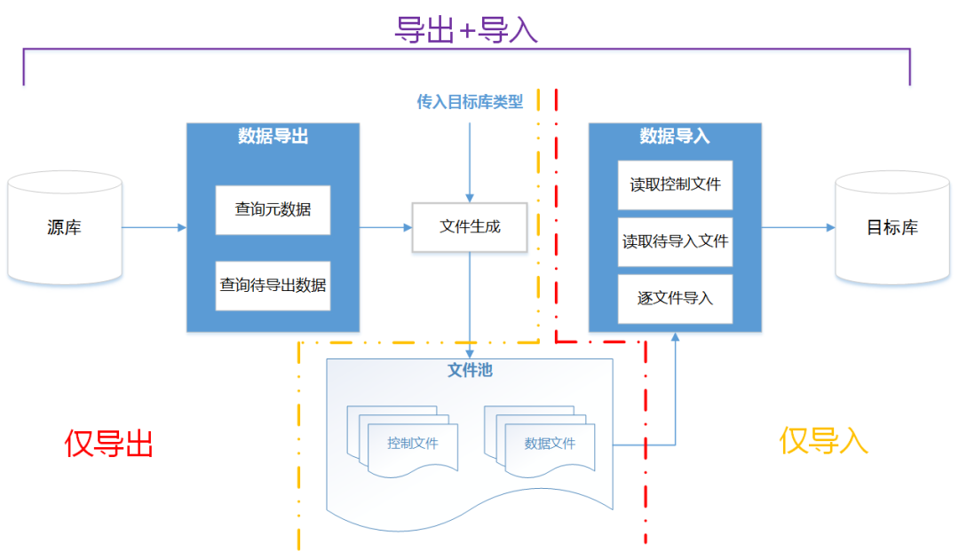 上图全图为完整流程,红色虚线左侧为仅导出流程,金色虚线右侧为仅导入流程,实际上的并发细节在图中做了省略。