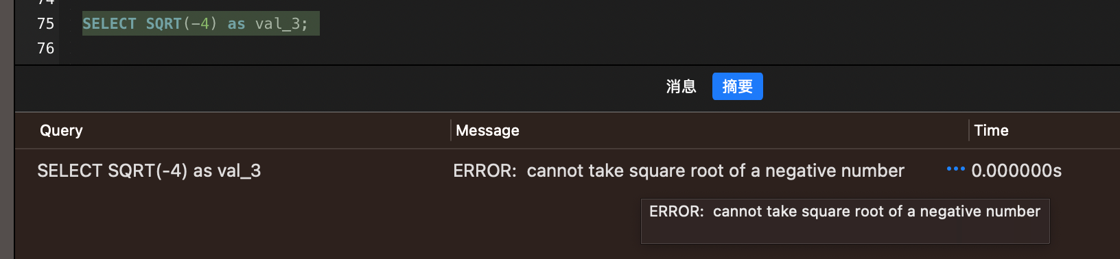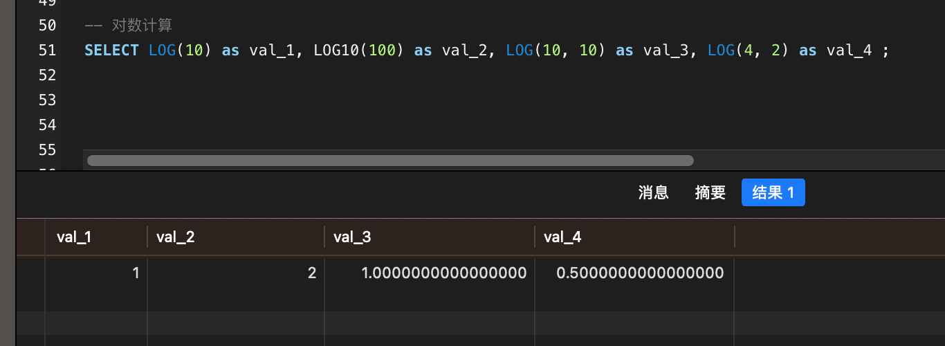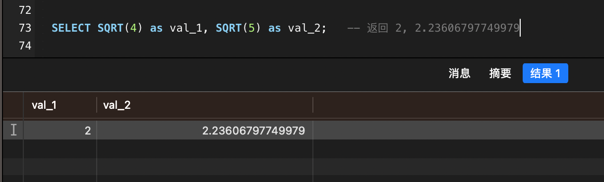 SELECT SQRT(4) as val_1, SQRT(5) as val_2; -- 返回 2, 2.23606797749979