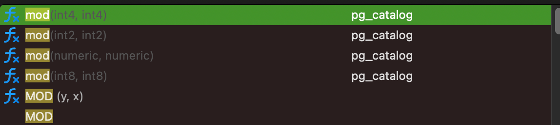 mod ( y numeric_type, x numeric_type ) → numeric_type