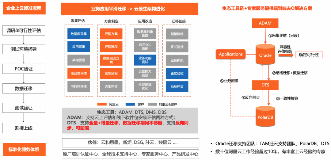 基于阿里巴巴集团去IOE的实践经验以及阿里云服务万千企业客户的技术沉淀,阿里云传承并发展了去O能力,积累了大量去O方法论和配套产品,如ADAM、DTS、PolarDB PostgreSQL版(兼容Oracle),形成了一套端到端的产品化、标准化、规模化的去O解决方案,从而帮助企业更加平滑迁移改造,降低客户“去IOE”风险。