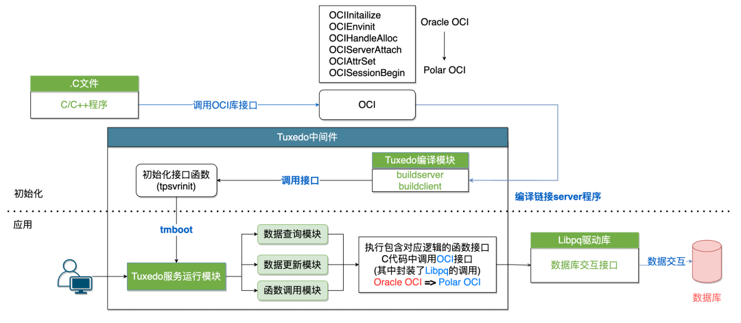 代码适配与驱动整合:首先,我们深度参与客户的代码调整工作,确保其能够顺利集成Polar OCI驱动。这一过程涉及将原有业务逻辑与数据库交互代码(包括连接管理、CRUD操作)与Polar OCI库的接口(如OCIInitialize, OCIEnvInit, OCIHandleAlloc等)紧密对接,为后续的无缝迁移奠定基础。 库替换与连接重构:紧接着,协助客户逐步将Oracle OCI库替换成Polar OCI库,通过一系列步骤,如设定服务器连接(OCIServerAttach)、会话初始化(OCISessionBegin)等,顺利完成数据库目标从Oracle到PolarDB的转变,确保底层通信协议的兼容与高效。 编译与服务启动:利用Tuxedo的编译工具链,我们对已完成适配的C代码实施编译与链接,生成服务端程序。此外,我们还优化了Tuxedo的标准初始化接口tpsvrinit,通过执行tmboot命令顺利部署服务,实现了与PolarDB的稳定连接。 环境验证与启动:最后,在此阶段末尾,我们确保所有初始化步骤正确执行,通过Tuxedo环境成功启动服务,标志着数据库连接与基础功能验证均达到预期,为应用层的深入适配铺平道路。