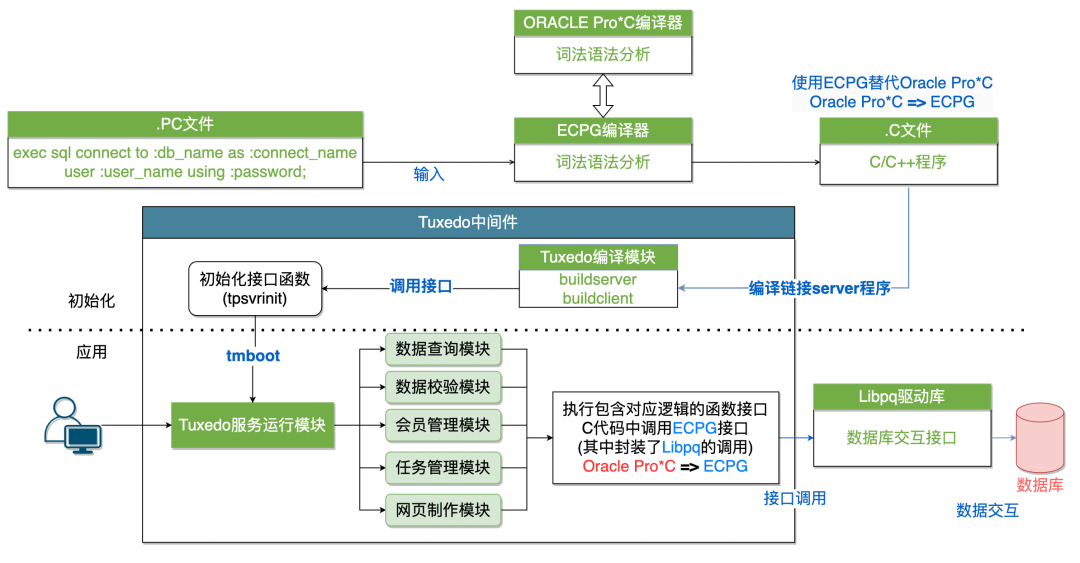 代码适配与ECPG集成:首先,我们的专家团队深入客户的代码基础,着手将原有业务逻辑与数据库操作代码(即含嵌入式SQL的PC代码)适配至ECPG驱动。这一阶段聚焦于保持业务逻辑不变的同时,确保ECPG的有效集成。 编译工具链升级:接着,我们将客户的编译环境从Oracle Pro*C转向ECPG编译器,这一转换要求对Makefile和依赖文件进行相应调整,以确保ECPG能够准确识别并处理嵌入式SQL代码,将其转化为调用ECPG接口的纯C代码。 编译与服务配置:通过修改后的Makefile,我们指导编译过程,将ECPG处理后的C代码与Tuxedo的编译模块相结合,编译链接成server程序。随后,通过执行tmboot命令,借助Tuxedo的标准化接口tpsvrinit成功启动服务,实现与PolarDB的初次握手。