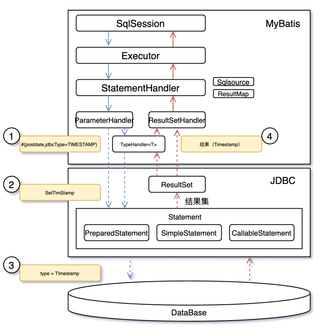 预处理语句(Prepared Statement) 参数绑定涉及将 Java 中的值映射到 PostgreSQL 的数据类型。 设置参数 & 绑定处理(Parameter Setting & Binding) 使用 setXXX() 方法,驱动记录在对应参数索引位置绑定的 Java 类型及值。 针对每个参数,生成对应的格式化值,比如将其转换为字符串或二进制表达。JDBC 驱动会根据之前调用的 setXXX() 方法来确定参数的 PostgreSQL 数据类型,并将这些信息以及参数的实际值发送到服务器。 类型推断(Type Inference) 服务器接收到参数和类型信息后,将其与预先创建的查询计划结合,进行类型匹配和推断。 结果返回(Result Return) 数据库处理结果后,通过结果集返回给 MyBatis 框架的ResultSetHandler,从而上传处理结果。