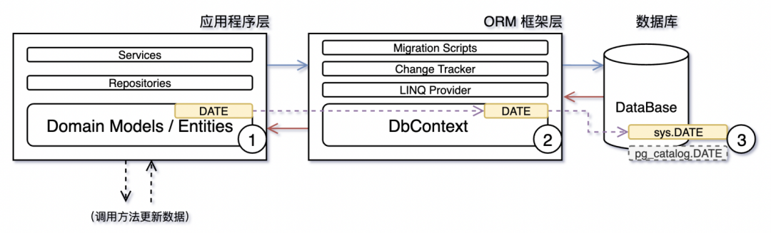 实体层(Entity Layer):在实体定义中,用户指定 TypeName 为 "DATE",这样做声明了表结构中的时间字段应映射为数据库的抽象 DATE 类型。 上下文层(DbContext Layer):在 DbContext 中,为 DATE 类型定义了一个内存中的表示。为适应不同的数据库驱动,这个类型需要有针对性的实现。对于 PolarDB 的 .NET 驱动,必要的工作是将实体的 DATE 类型映射为数据库中的 64 位 date 类型。 数据库层(Database Layer):在数据库端,PolarDB 提供了 DATE 类型的完整的 64 位实现,这确保了数据表中的时间字段保持了和 Oracle 中相同的精度。