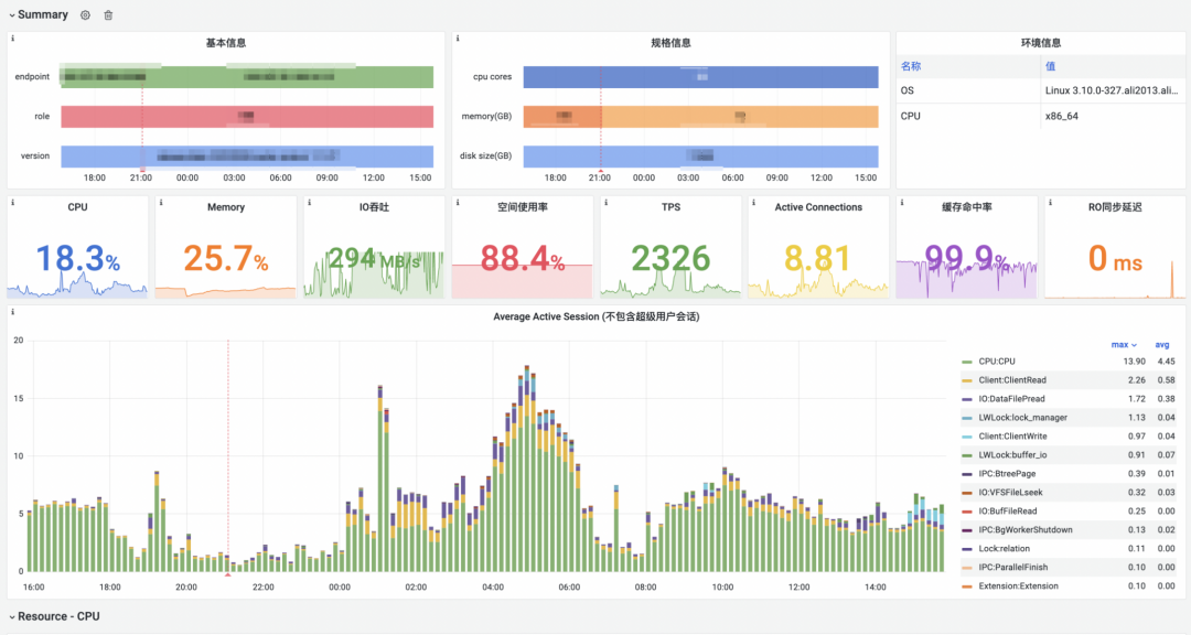 PolarDB-PG还支持使用全局自动负载信息库(Global Automatic Workload Repository,简称GAWR)对数据库进行全方位多维度的监控。如下图所示,监控指标涵盖CPU、内存、I/O、文件系统、TPS、连接数、缓存命中率、延迟、慢SQL等多个维度,基于这些指标可以对数据库系统问题进行详细分析。