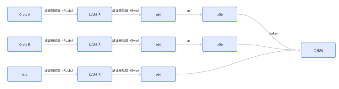 首先,我们需要大致了解一下 Rust 编译过程。Rustc 先把 Rust 代码编译为 LLVM-IR