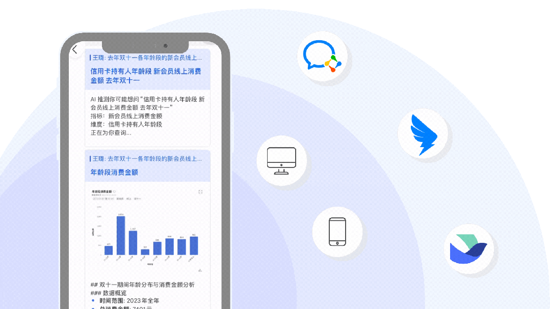 DataGPT支持打通企微、钉钉、飞书,可以在聊天机器人界面问答。无论在外出差还是在忙碌的会议中,都能随时随地掌握数据动态。