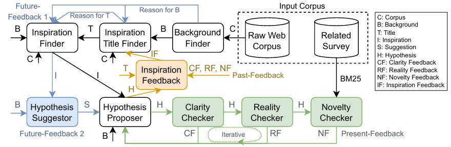 开发了一个先进的自然语言处理(NLP)数据集,专门用于开放领域的科学假设探索。 设计了一个创新的多模块系统(MOOS)以及三种反馈策略,这些策略显著提升了科学假设生成的准确性,并成功验证了从原始网络语料库中提取科学假设的可行性。