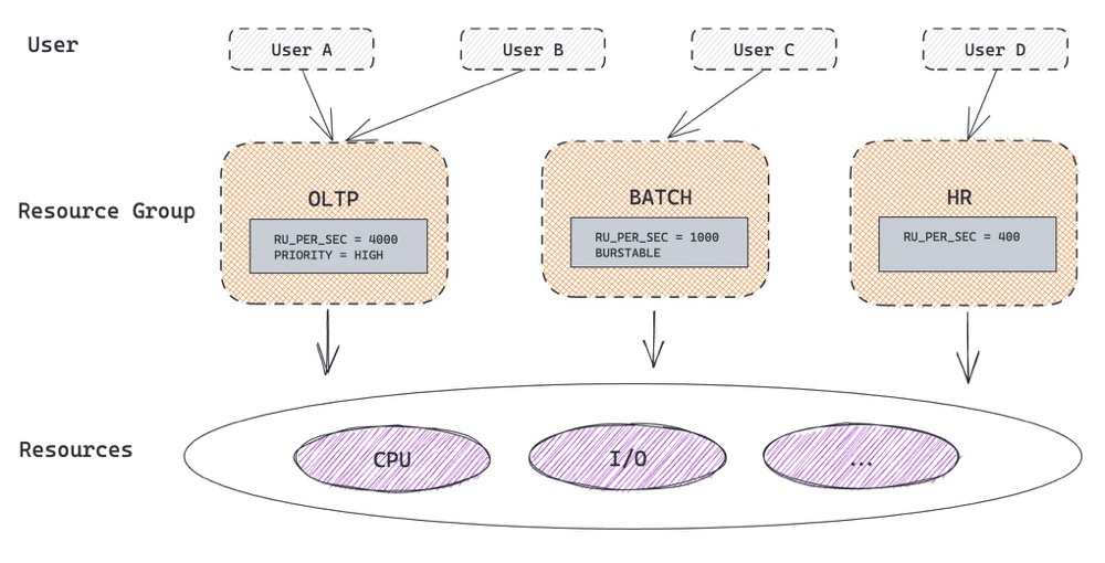 资源组(Resource Group):是 TiDB 中用于资源管理的逻辑单元,每个会话都归属于一个资源组,共享该组的资源限额。TiDB 允许将数据库用户映射到不同的资源组,未明确指定资源组的用户则默认关联至系统预设的default 资源组。