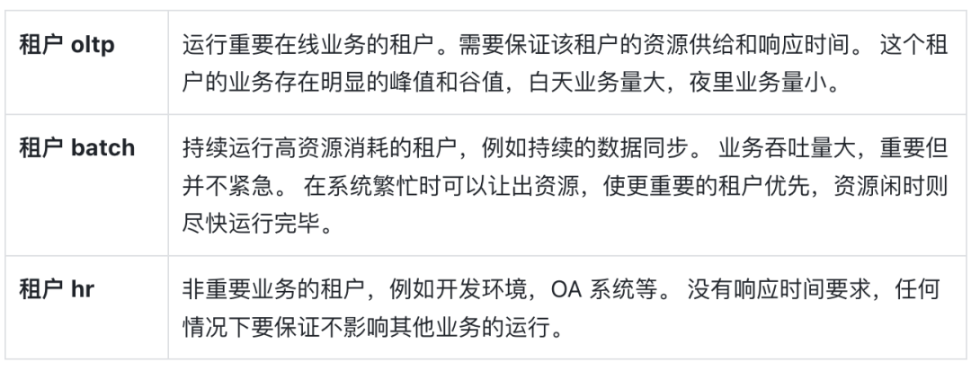 为租户 oltp 分配一个较高的用量,租户 batch 和 租户 hr 则相对低,这样在系统资源紧张的情况下,保证租户 oltp 的服务质量。
