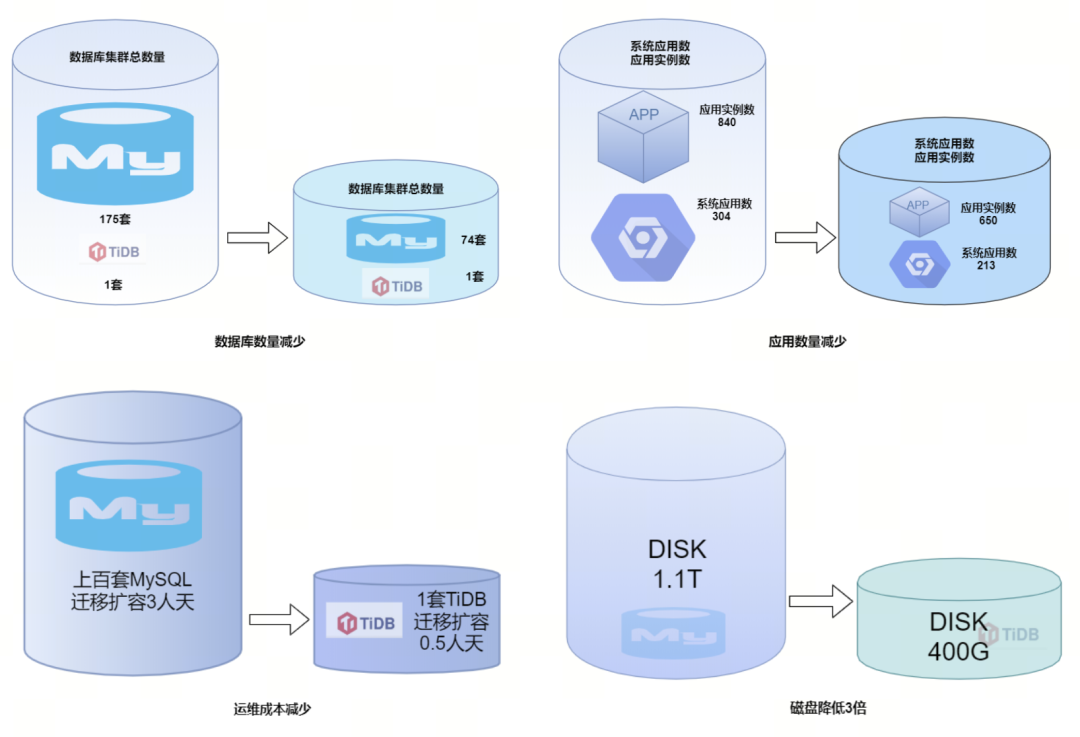 简化系统架构与提高效率:将 100+套 MySQL 实例合并至 1 套 TiDB ,简化系统架构,降低复杂性,集中运维,提升开发团队效率。