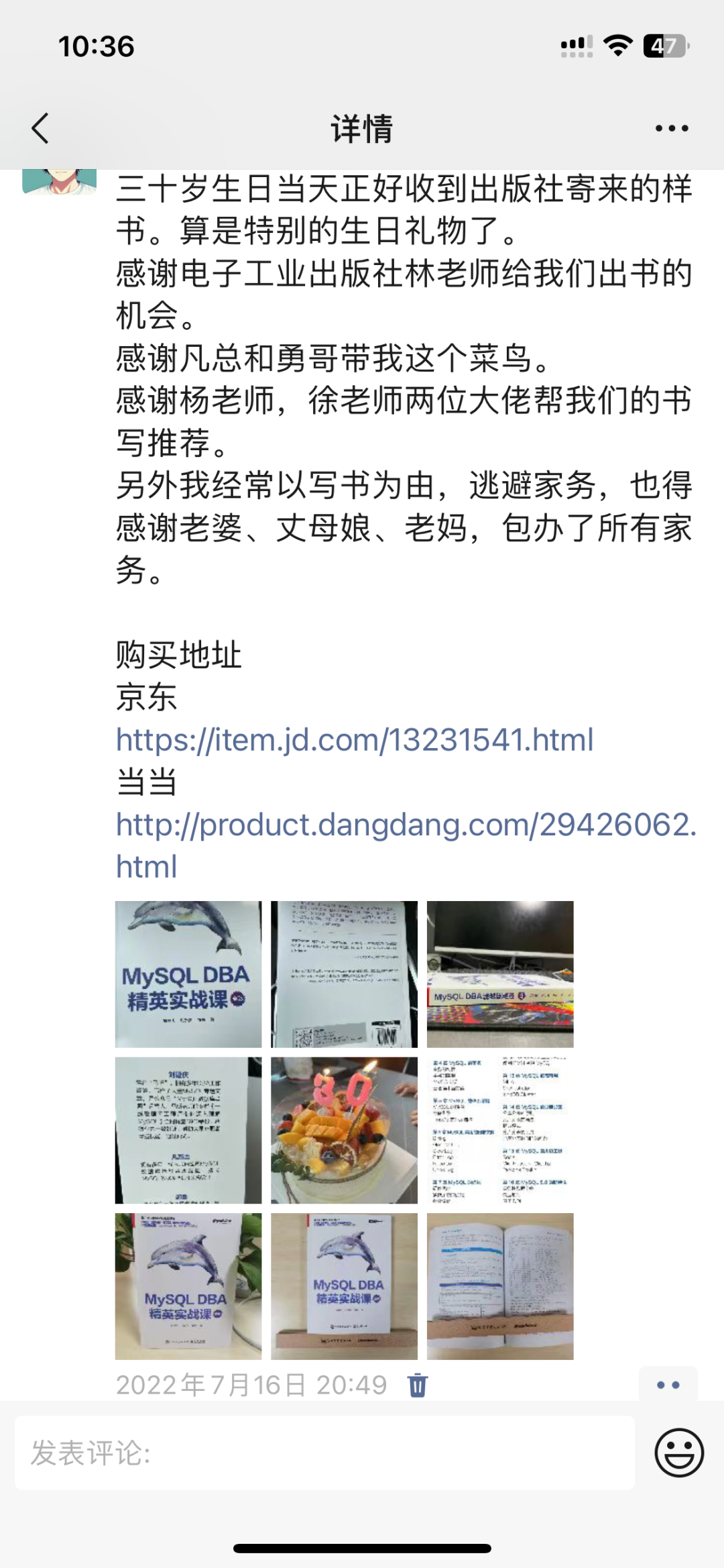 2022年7月16日,收到了出版社寄来的《MySQL DBA 精英实战课》样书,当时很激动,发了一条朋友圈: