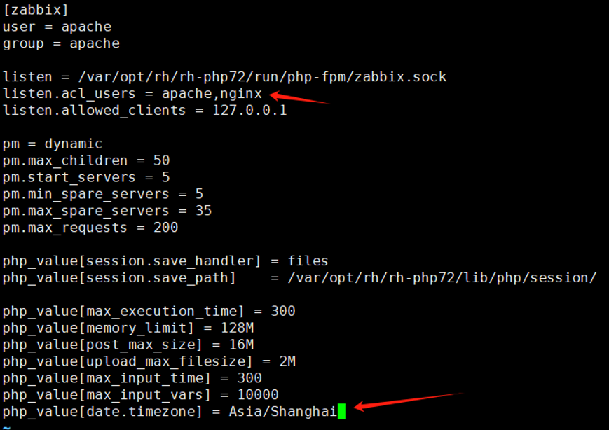 /etc/opt/rh/rh-php72/php-fpm.d/zabbix.conf # 添加nginx,配置时区