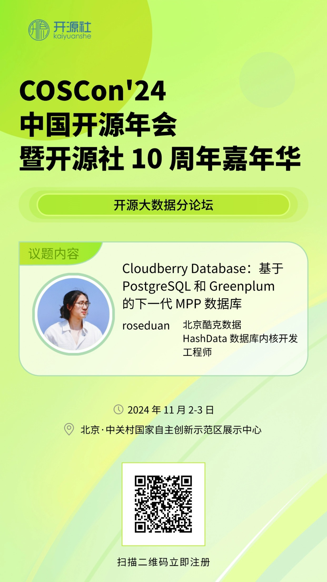 2024 年,恰逢开源社 10 周年,众多社区将共襄盛举,联合带来不同主题方向的专题论坛,涵盖 Web 应用开发、云计算、大数据、人工智能、Web3.0 等技术,及开源评价标准、开源治理、开源人才教育等方向。其中,Cloudberry Database 社区的两位成员也将出席,并带来令人期待的分享。