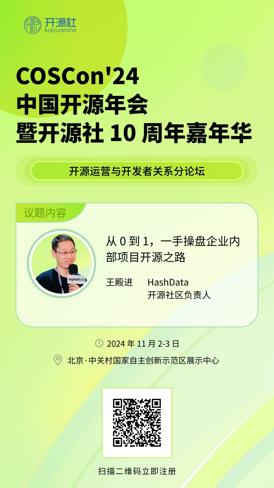 欢迎感兴趣的朋友扫码海报二维码报名大会,11 月 2-3 日期待与您相约 COSCon'24 第九届中国开源年会!