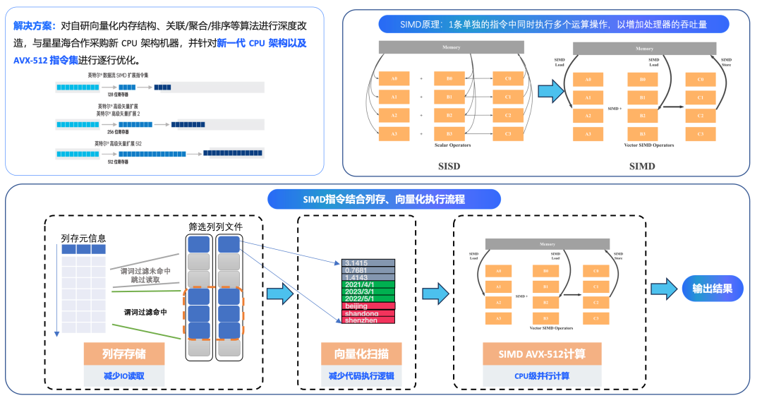 列式存储优化了数据的物理存储方式,使得数据按列存储,提高了数据压缩比和数据读取效率。向量化执行引擎则利用现代 CPU 的 SIMD 指令集,实现了单条指令处理多条数据,显著提升了数据处理速度。TDSQL 通过深度优化算法和数据结构,以适应新一代 CPU 的特性,实现单核效率的倍数提升。