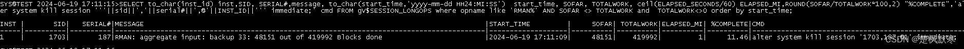 where opname like 'RMAN%' AND SOFAR <> TOTALWORK and TOTALWORK<>0 order by start_time;