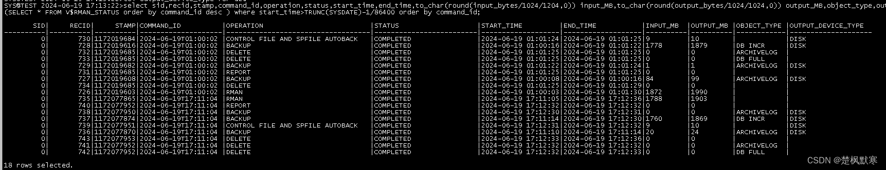 object_type,output_device_type from (SELECT * FROM V$RMAN_STATUS order by command_id desc ) where start_time>TRUNC(SYSDATE)-1/86400 order by command_id;