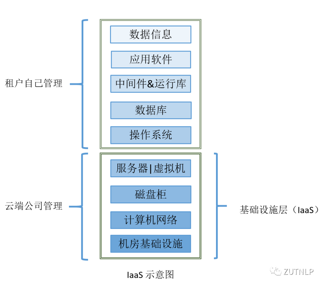 IaaS是Infrastructure as a server的缩写,意思是基础设施即服务。云端公司把IT环境的基础设施建设好,然后直接对外出租硬件服务器或者虚拟机。消费者可以利用所有计算基础设施,包括处理CPU、内存、存储、网络和其它基本的计算资源,用户能够部署和运行任意软件,包括操作系统和应用程序。消费者不管理或控制任何云计算基础设施,但能控制操作系统的选择、存储空间、部署的应用,也有可能获得有限制的网络组件(例如路由器、防火墙、负载均衡器等)的控制。如下图所示: