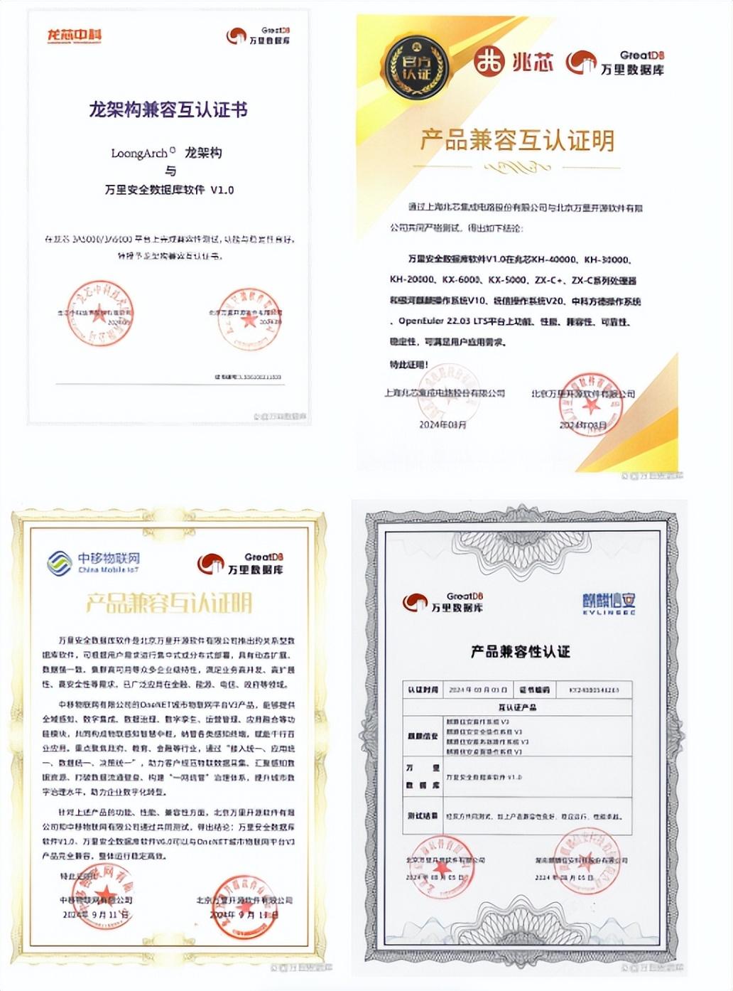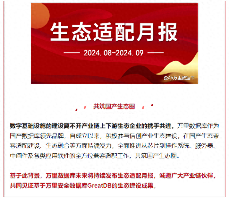 在过去的8-9月,万里数据库先后与龙芯中科、兆芯、麒麟信安、广电五舟、中移物联网及卓望数码等10家生态厂商完成近30款产品的兼容适配工作,进一步加强了国产基础软硬件生态建设,稳固操作系统、CPU及服务器等底层生态链条合作。