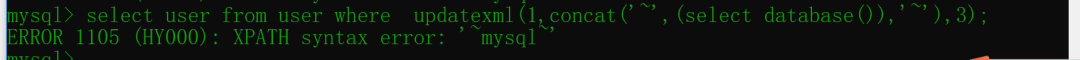 由于updatexml 语句的特性 这样写肯定会报错 因为concat为字符串连接函数 但是 爆出了 当前使用的数据库名字