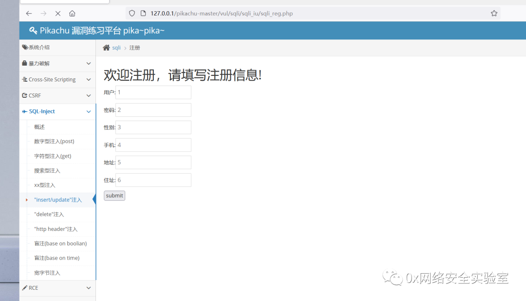 这里我们通过 pikachu靶场练习一下 insert注入 在用户注册信息的时候 数据库中通常采用 insert语句进行插入数据