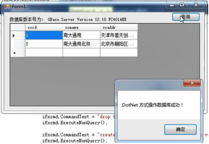 出现 Form1 界面后,点击查询,将显示 company 表记录及弹出框提示成功。