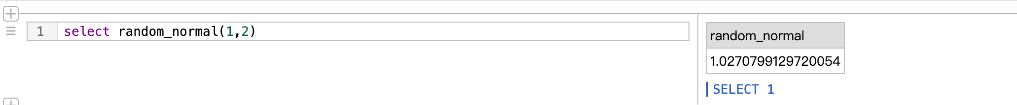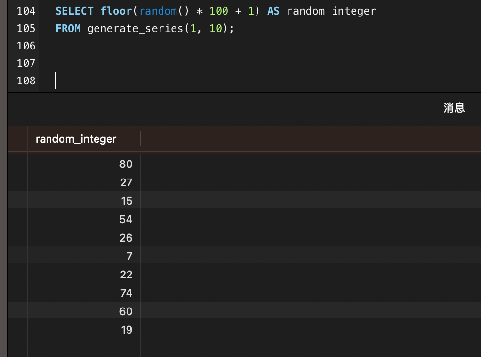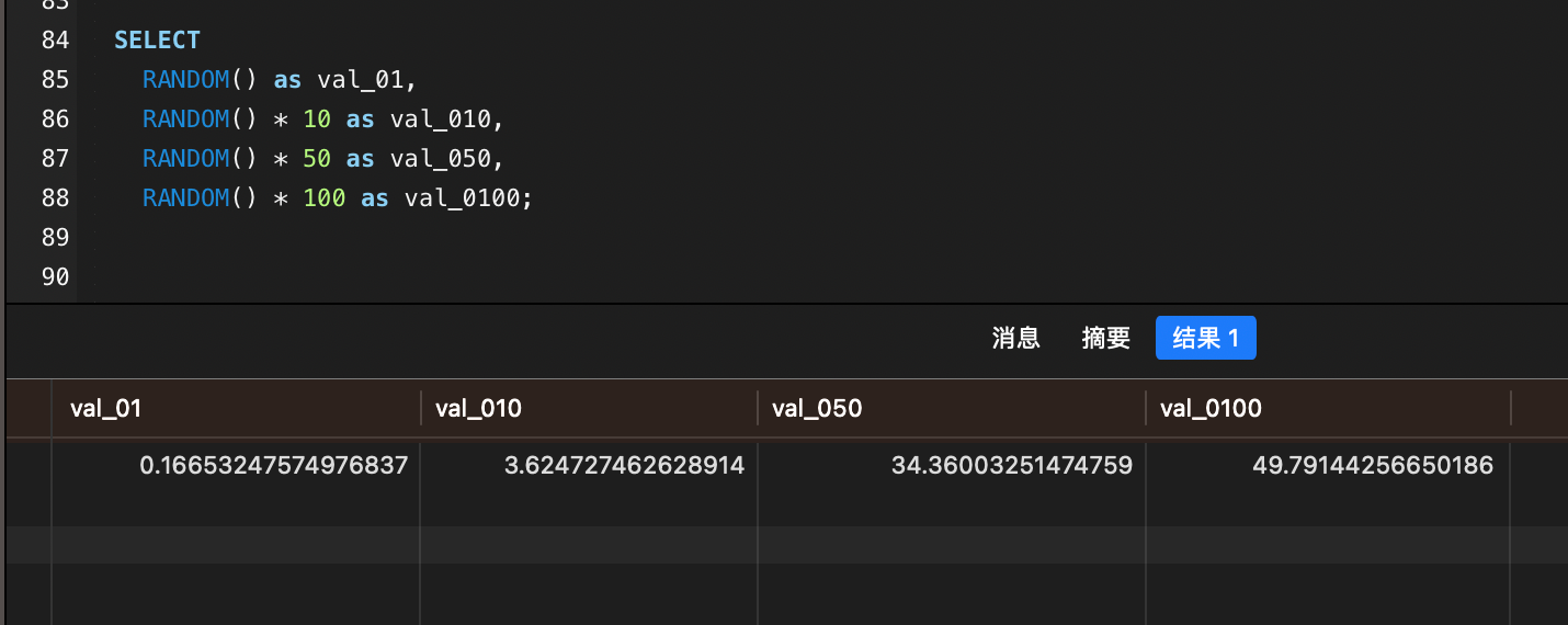 RANDOM() * 100 as val_0100; -- 随机 0 ~ 100 之间的数如果想生成一些测试数据,例如想生成10个在 [1, 100] 范围内的随机整数,可以这样子操作