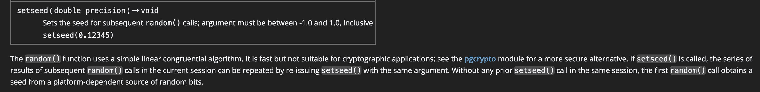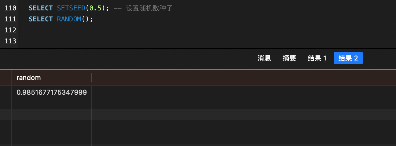 SELECT SETSEED(0.5); -- 设置随机数种子