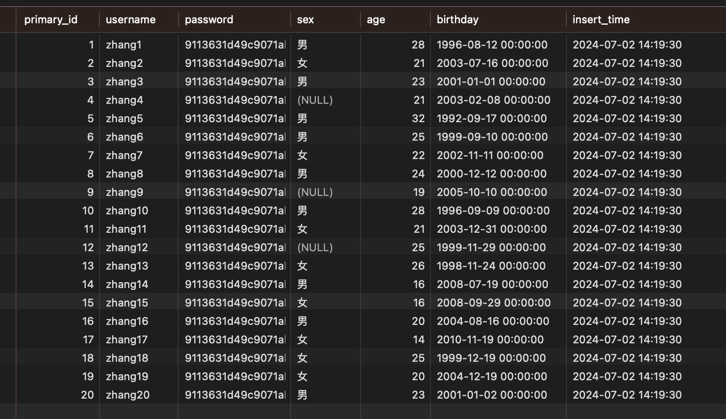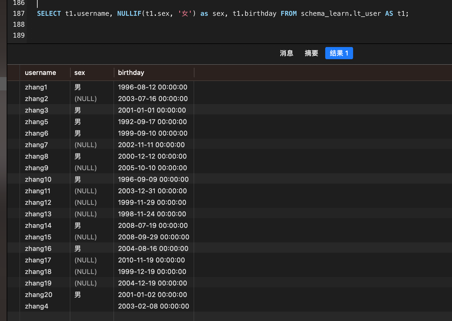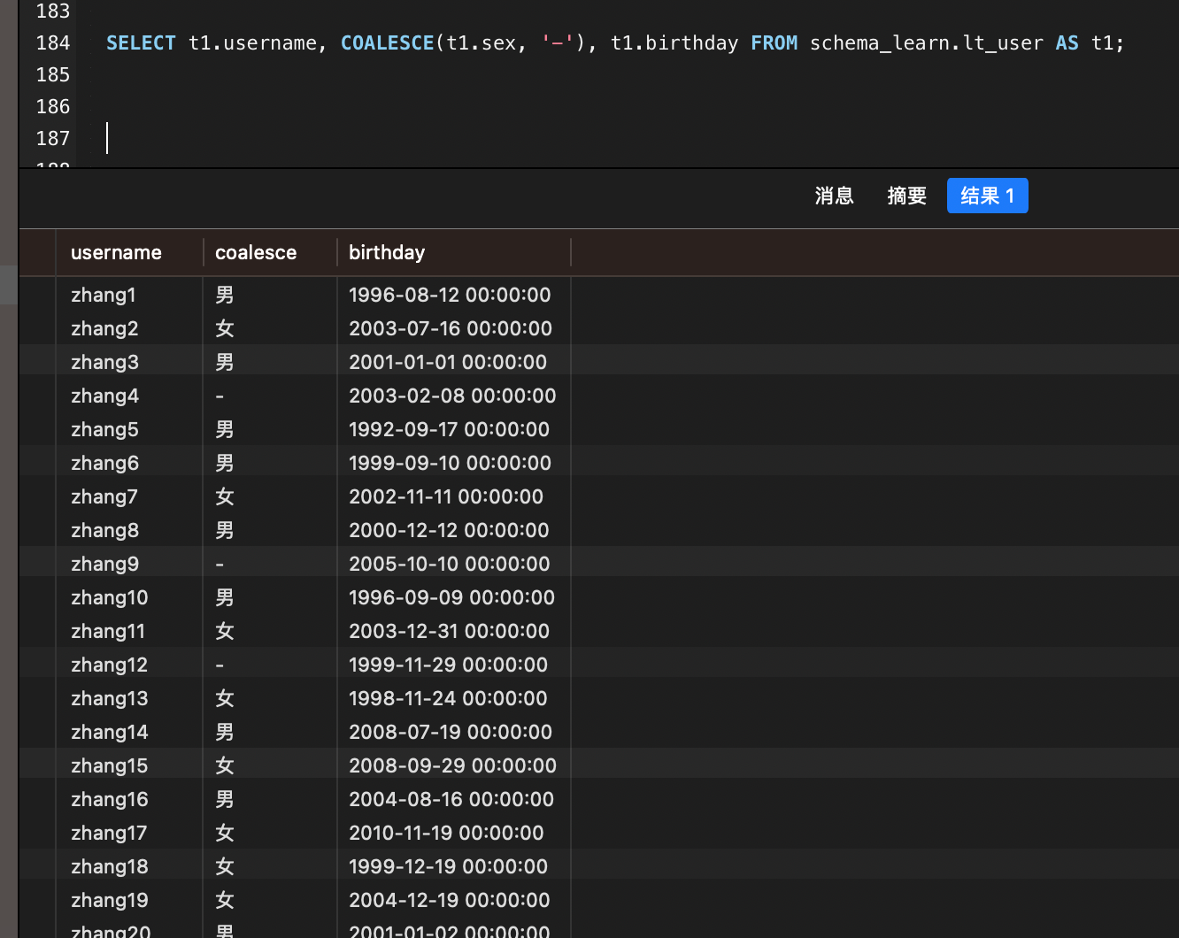 SELECT COALESCE(t12.ind_unit, '%') AS effective_login FROM t12;再者,我有一张测试表,想在查询时处理性别(sex)为空的设置为 “-”