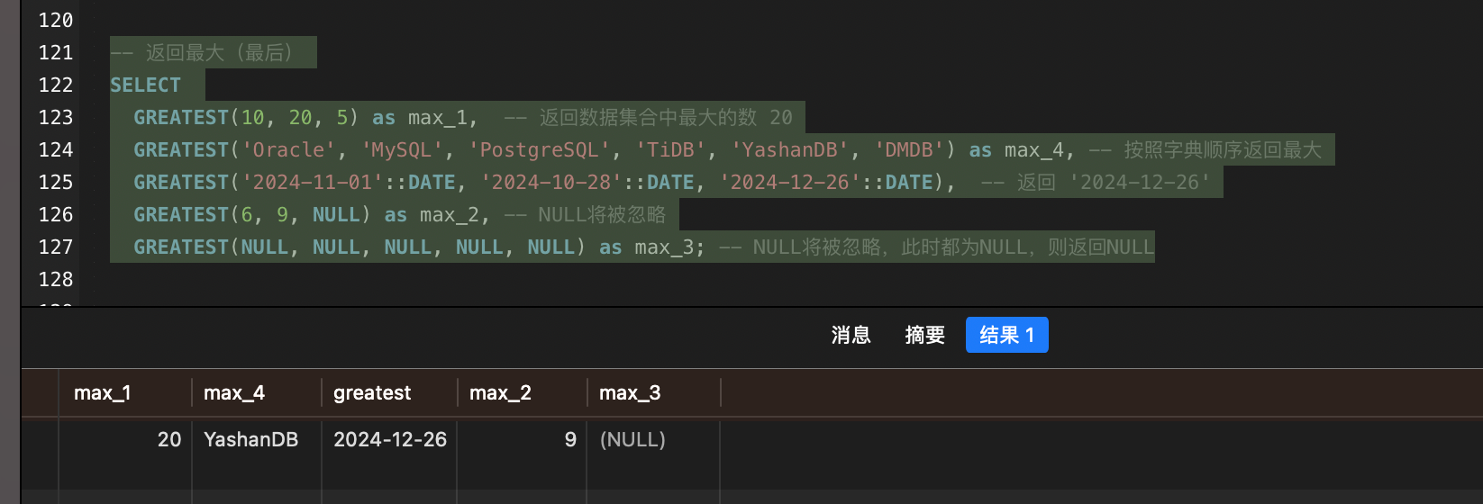 GREATEST('Oracle', 'MySQL', 'PostgreSQL', 'TiDB', 'YashanDB', 'DMDB') as max_4,
