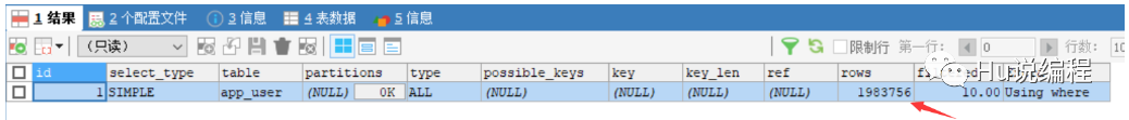 创建索引之前查看查找语句执行情况:无索引查询1983756行