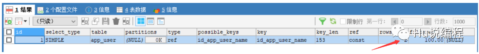 创建索引之后查看查找语句执行情况:根据索引只查询两行,索引在数据量大的情况下十分有用