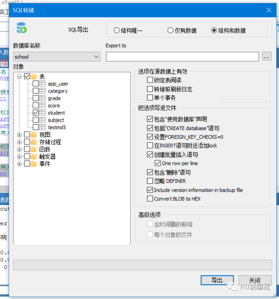 mysqldump -hlocalhost -uroot -p123456 school student grade >D:/student.sql