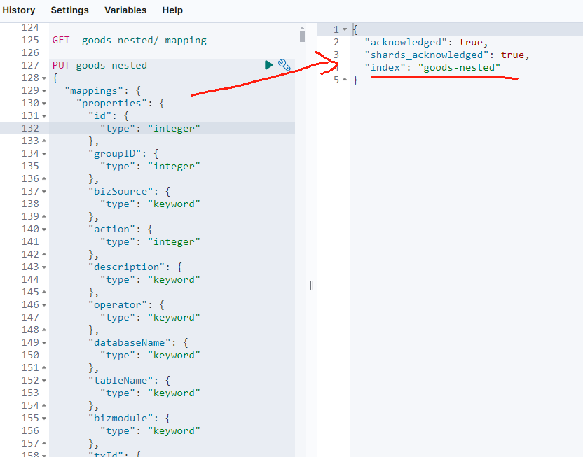 PUT goods-nested{"mappings": {"properties": {"id": {"type": "integer"},"groupID": {"type": "integer"},"bizSource": {"type": "keyword"},"action": {"type": "integer"},"description": {"type": "keyword"},"operator": {"type": "keyword"},"databaseName": {"type": "keyword"},"tableName": {"type": "keyword"},"bizmodule": {"type": "keyword"},"txId": {"type": "keyword"},"newObject": {"type": "nested","properties": {"goodsID": {"type": "integer"},"goodsName": {"type": "keyword"},"goodsCode": {"type": "keyword"}}},"oldObject": {"type": "nested","properties": {"goodsID": {"type": "integer"},"goodsName": {"type": "keyword"},"goodsCode": {"type": "keyword"}}},"fieldsDescription": {"type": "nested","properties": {"goodsID": {"type": "integer"},"goodsName": {"type": "keyword"},"goodsCode": {"type": "keyword"}}}}}}