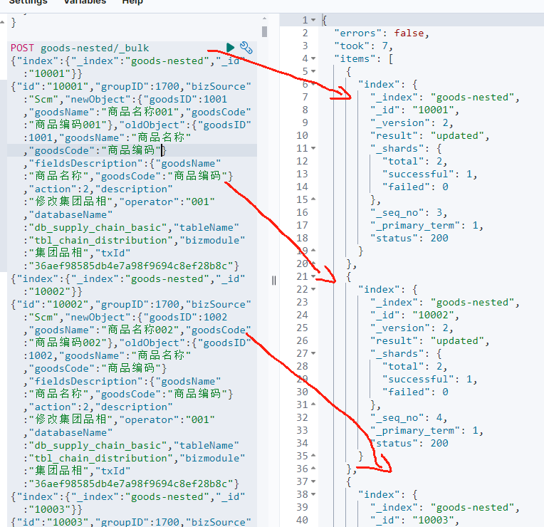 POST goods-nested/_bulk{"index":{"_index":"goods-nested","_id":"10001"}}{"id":"10001","groupID":1700,"bizSource":"Scm","newObject":{"goodsID":1001,"goodsName":"商品名称001","goodsCode":"商品编码001"},"oldObject":{"goodsID":1001,"goodsName":"商品名称","goodsCode":"商品编码"},"fieldsDescription":{"goodsName":"商品名称","goodsCode":"商品编码"},"action":2,"description":"修改集团品相","operator":"001","databaseName":"db_supply_chain_basic","tableName":"tbl_chain_distribution","bizmodule":"集团品相","txId":"36aef98585db4e7a98f9694c8ef28b8c"}{"index":{"_index":"goods-nested","_id":"10002"}}{"id":"10002","groupID":1700,"bizSource":"Scm","newObject":{"goodsID":1002,"goodsName":"商品名称002","goodsCode":"商品编码002"},"oldObject":{"goodsID":1002,"goodsName":"商品名称","goodsCode":"商品编码"},"fieldsDescription":{"goodsName":"商品名称","goodsCode":"商品编码"},"action":2,"description":"修改集团品相","operator":"001","databaseName":"db_supply_chain_basic","tableName":"tbl_chain_distribution","bizmodule":"集团品相","txId":"36aef98585db4e7a98f9694c8ef28b8c"}{"index":{"_index":"goods-nested","_id":"10003"}}{"id":"10003","groupID":1700,"bizSource":"Scm","newObject":{"goodsID":1003,"goodsName":"商品名称003","goodsCode":"商品编码003"},"oldObject":{"goodsID":1003,"goodsName":"商品名称","goodsCode":"商品编码"},"fieldsDescription":{"goodsName":"商品名称","goodsCode":"商品编码"},"action":2,"description":"修改集团品相","operator":"001","databaseName":"db_supply_chain_basic","tableName":"tbl_chain_distribution","bizmodule":"集团品相","txId":"36aef98585db4e7a98f9694c8ef28b8c"}