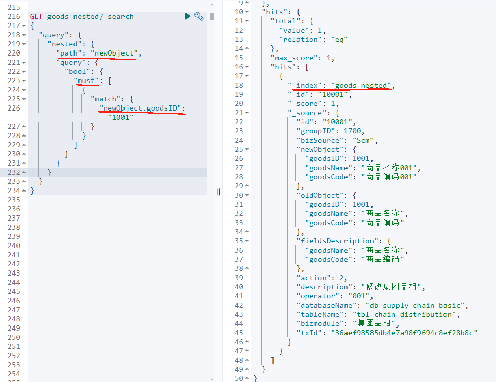 GET goods-nested/_search{"query": {"nested": {"path": "newObject","query": {"bool": {"must": [{"match": {"newObject.goodsID": "1001"}}]}}}}}
